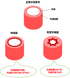 気管支の炎症が悪化すると粘膜のむくみが生じて、痰や咳などの症状がみられます。また気道が狭くなり、空気が通りにくくなることで喘鳴や息苦しさなど様々な症状を引き起こします。